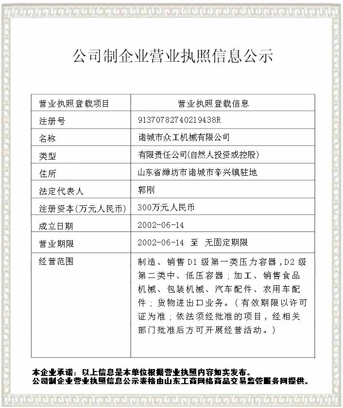 眾工公司創(chuàng)建于2002年,致力于從事智能食品機(jī)械設(shè)備制造,主要產(chǎn)品有:全自動(dòng)殺菌鍋、新含氣調(diào)理殺菌鍋、夾層鍋、蒸煮鹵鍋、鵪鶉蛋生產(chǎn)線(xiàn)、鹵蛋、變溫壓差膨化、真空凍干設(shè)備等自動(dòng)化設(shè)備,公司集研究、設(shè)計(jì)、制造、服務(wù)于一體,并擁有自主進(jìn)出口經(jīng)營(yíng)權(quán)。公司被評(píng)為高新技術(shù)企業(yè)(證書(shū)編號(hào):GR202237007238),擁有壓力容器制造許可資質(zhì)(證書(shū)編號(hào):TS2237350-2025),并成功通過(guò)了山東省質(zhì)檢局的“KYL型殺菌鍋快開(kāi)門(mén)連鎖裝置”的鑒定(編號(hào):SY-WT-2010-0019),產(chǎn)品通過(guò)ISO9001國(guó)際質(zhì)量管理體系認(rèn)證......