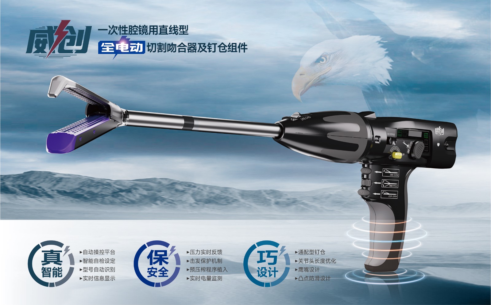 “威創(chuàng)”是一款全球獨創(chuàng)的具有自主知識產(chǎn)權的全電動智能腔鏡切割吻合器。它搭載了全新智能芯片,手術時可以實時反饋擊發(fā)阻力,使術者的操作更加游刃有余。同時,“威創(chuàng)”還具備智能自檢設定、型號自動識別和實時信息顯示等功能,為術者帶來了全新的人機交互體驗。在安全性方面,“威創(chuàng)”具備擊發(fā)保護機制和預壓榨程序植入等卓越的安全保護機制,這使得切割吻合和成釘效果更加平穩(wěn),并大大提高了手術的安全性和效率。